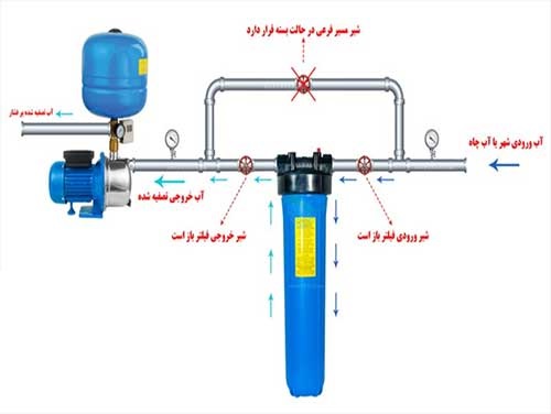 در ورودی آب به منابع آب شهری و چاه می توان برای جلوگیری از ورود ذرات جامد از فیلترهای با بستر پلیمری استفاده کرد. این فیلترها صرفا برای تصفیه فیزیکی آب مناسب می باشند و ضدعفونی، میکروب کشی، نمک زدایی و حذف بو و طعم را انجام نمی دهند.